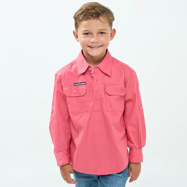 HAZELDEAN|Kids Half Button Long Sleeve Work Shirt | Hibiscus Pink