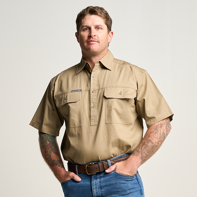 KILCOY | Mens Half Button Short Sleeve Work Shirt |Khaki
